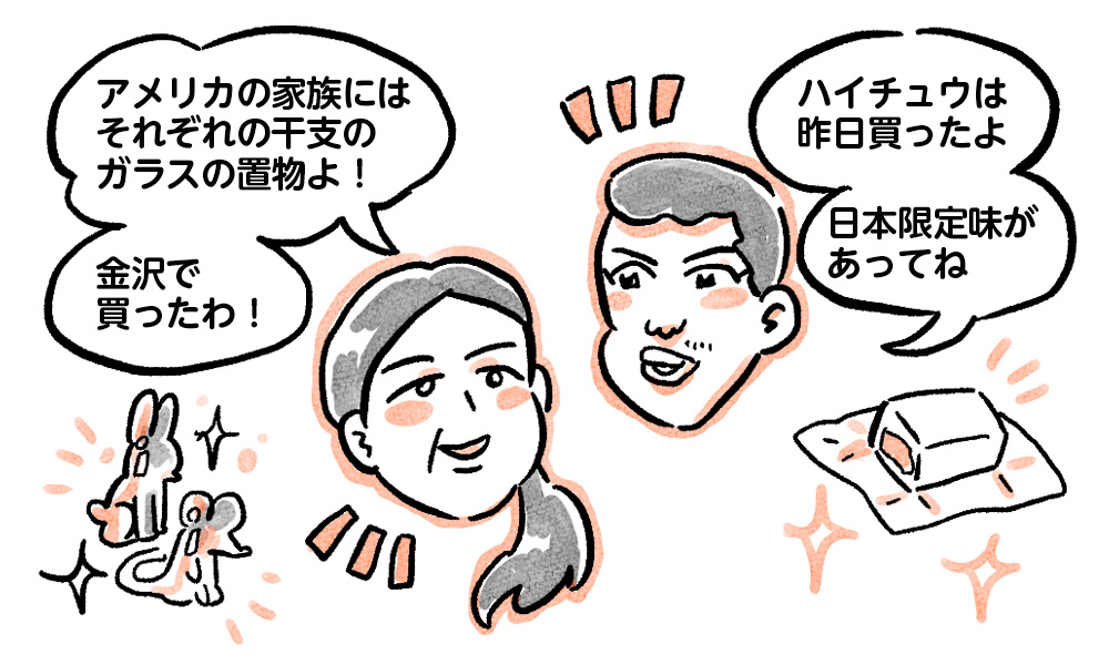 「それと、アメリカの家族にはガラス製の干支フィギュアを買ったの。金沢で見つけたんだけど、すごく繊細で綺麗だったから」