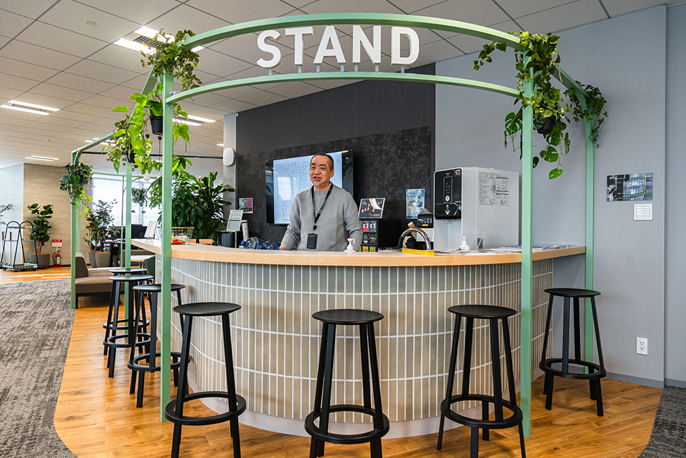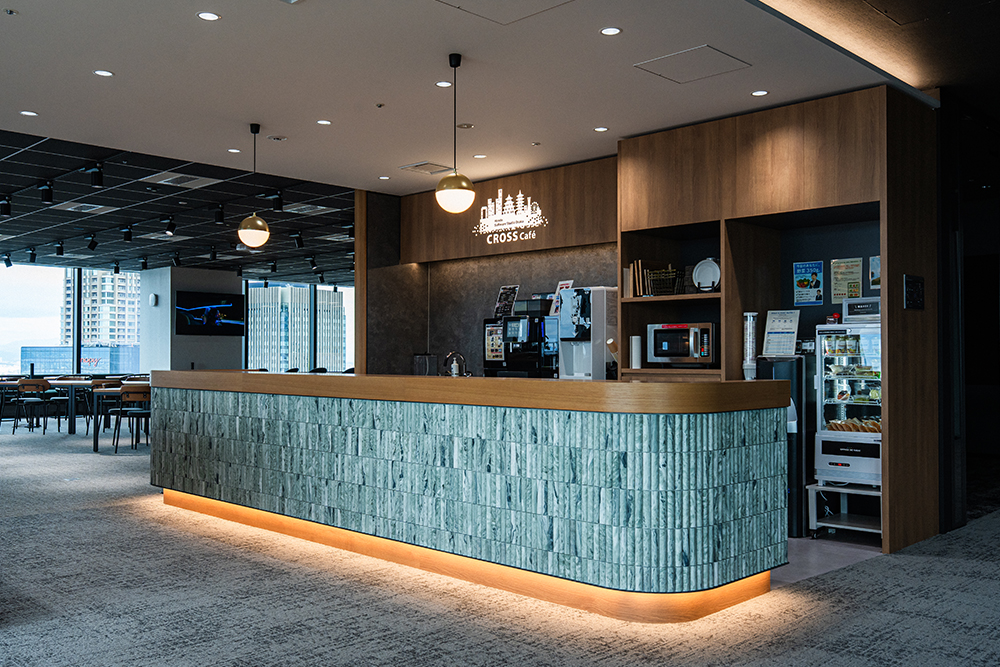 鈴木:弊スタジオは3つのカフェスペースを設けており、1つ目のカフェがこの「CROSS Cafe」。無料で利用できるドリンクマシンが置いてあり、休憩だけでなくちょっとした打ち合わせにも使えます。ランチ時には、カウンターでお弁当販売も行っています。