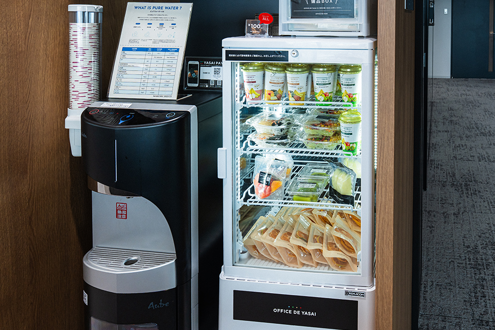鈴木:また、オフィスなどの空間を「人間の健康」の視点で評価・認証するアメリカの「WELL認証」で最高評価のプラチナ取得を目指しており、社員の栄養管理の取り組みのひとつとして100円で購入できる野菜や果物などを置いています。