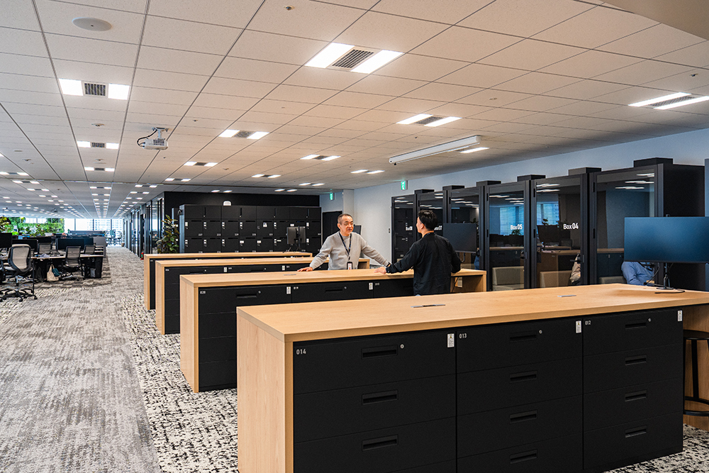 回遊式オフィスを進んでいくと、個人ロッカースペースと作業台が現れます。第2の執務エリアです。