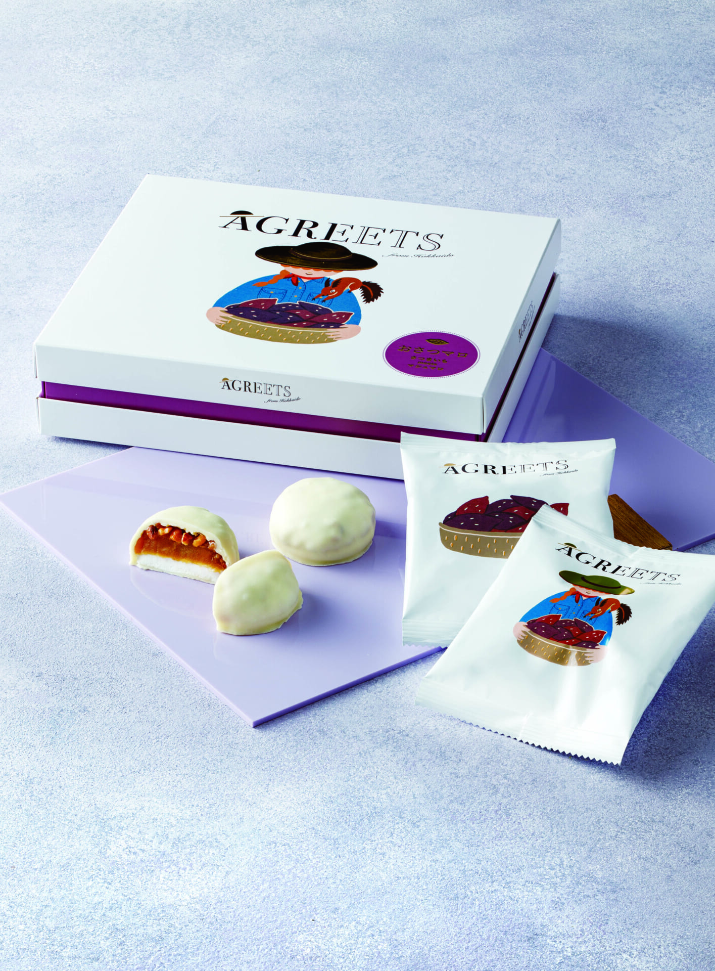 北のスイーツ王国・北海道スイーツがバレンタイン会場に集結。北海道銘菓「白い恋人」の「ISHIYA」と大丸松坂屋がコラボした新ブランド「AGREETS」から「おさつマロ」(1,792円/4個入り)が登場。北海道産さつまいも「由栗いも」の餡をマシュマロと合わせてホワイトチョコレートで包んでいます。