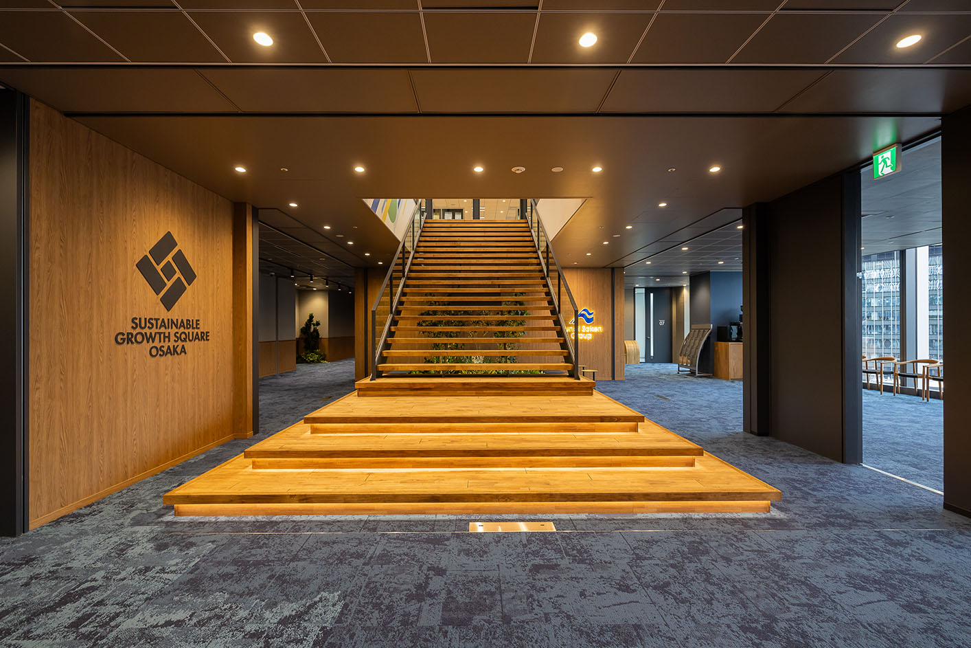 Enz’Arena前の内階段を使えば、上下階の移動もスムーズです。社内に内階段を設けることで、フロア同士をシームレスにつなぎたい——そんなこだわりがあったといいます。 モチーフは、船着き場の階段「水辺の雁木(がんぎ)」。一歩ずつ上るたびに、伝統から革新へ、過去から未来へとシンボリックなゲートウェイとしてデザインされています。