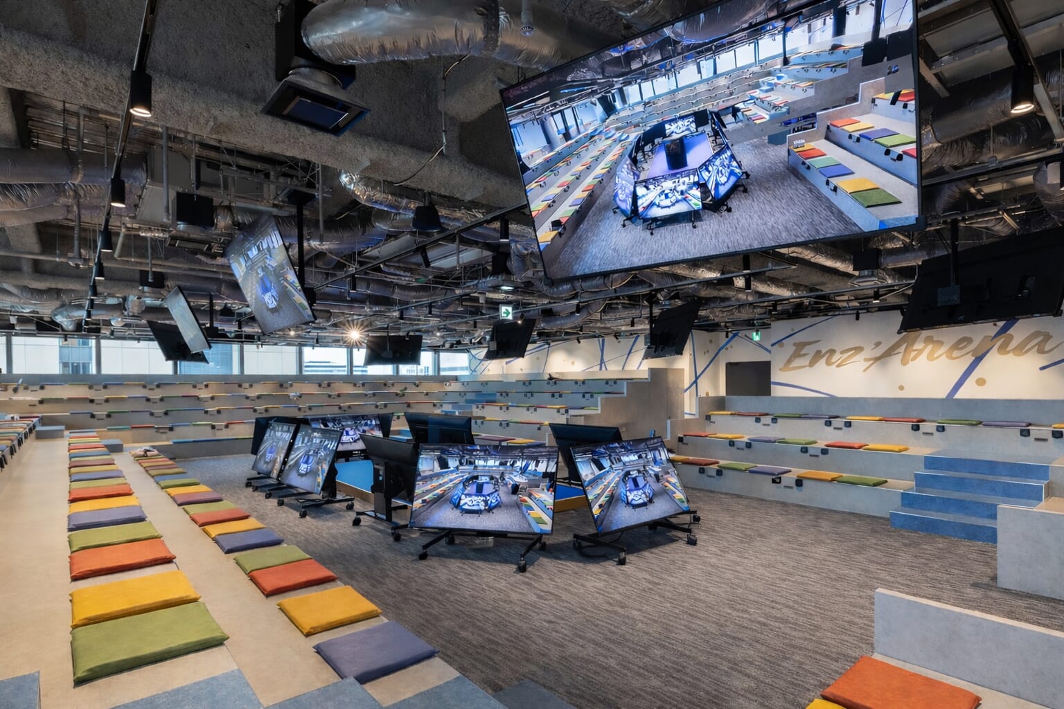 天井はあえて剥き出し。幾多のモニターが全方向に取り囲み、段差状の座席がアリーナのように広がります。強いキャラクターを放つ、機能美に満ちた空間です。