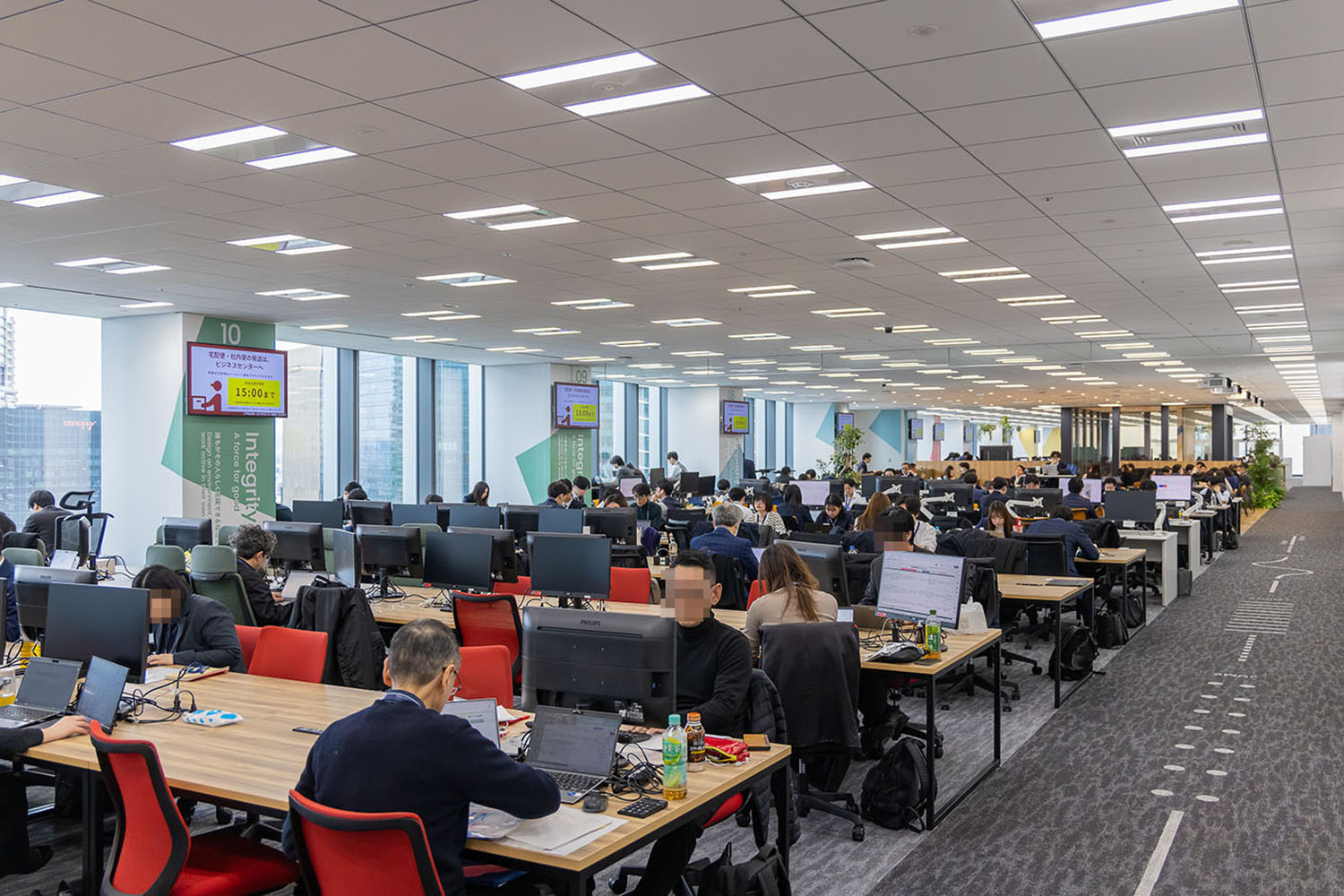 こちらの風景が、船井総研グループの執務スペースです。柱や壁がない、見事なまでのシームレスぶりは圧巻。 しかも、このフロアだけで6社のグループカンパニーが集っているというから二度驚きです。どこからどの会社なのかは、ぱっと見ただけではわかりません。