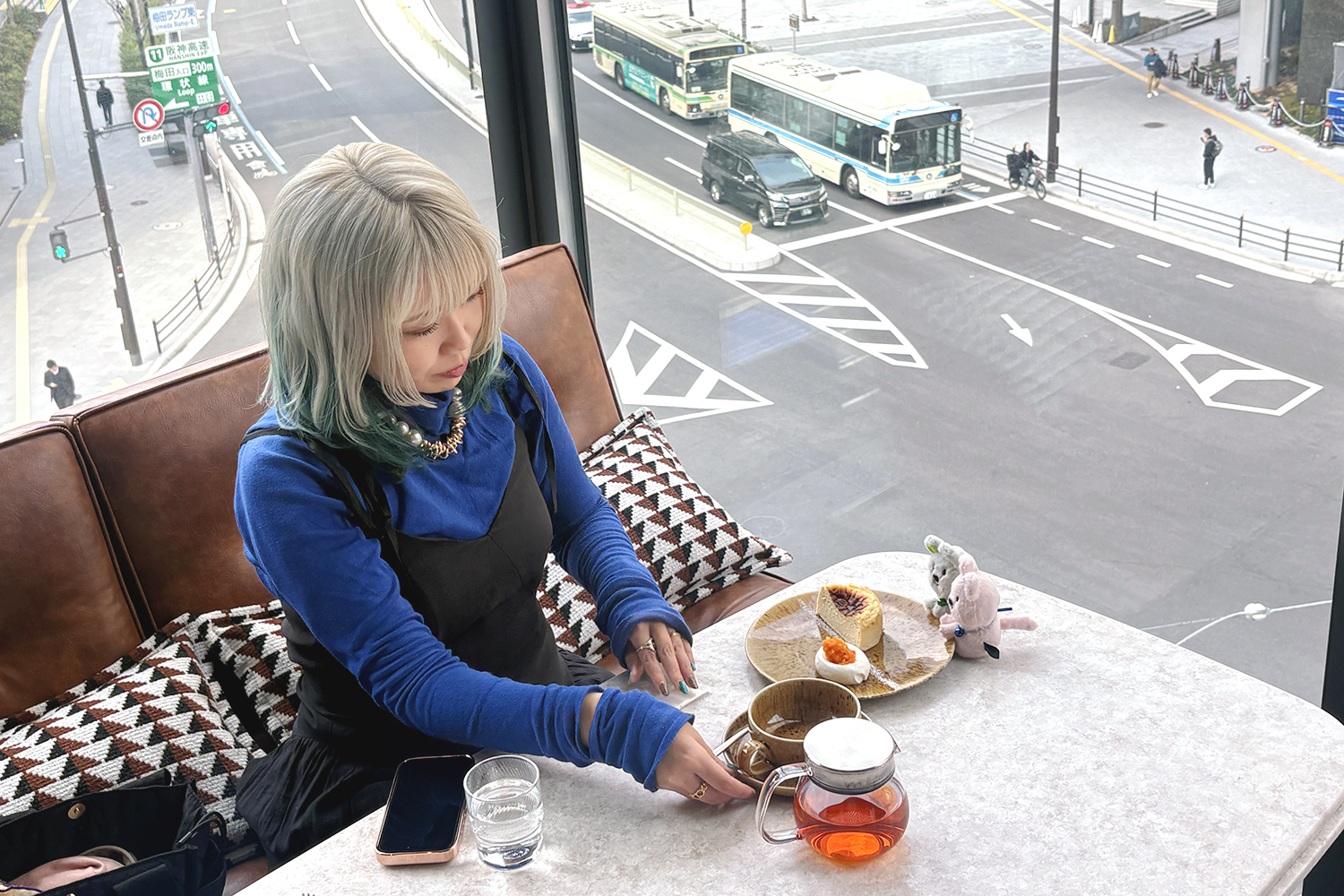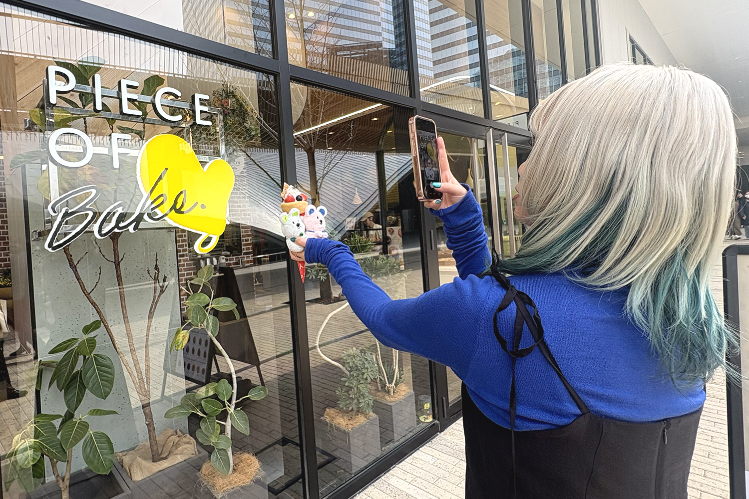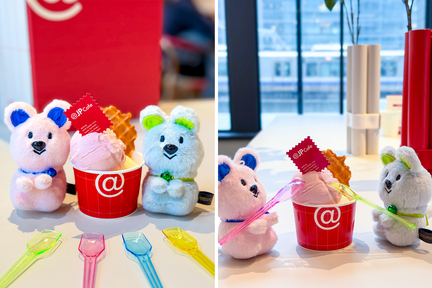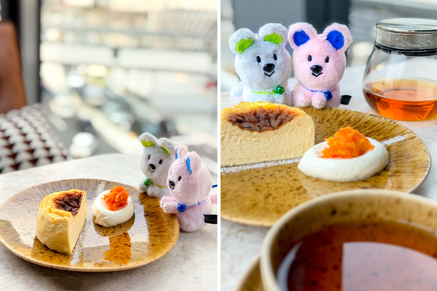 ここでは、窓際の席を活かして、抜け感のある写真を撮ってみました(左写真)。デザートとぬいを窓側に寄せて、ぬいが「おいしそう!」と覗き込んでいるように置くと、写真にストーリーが生まれます。