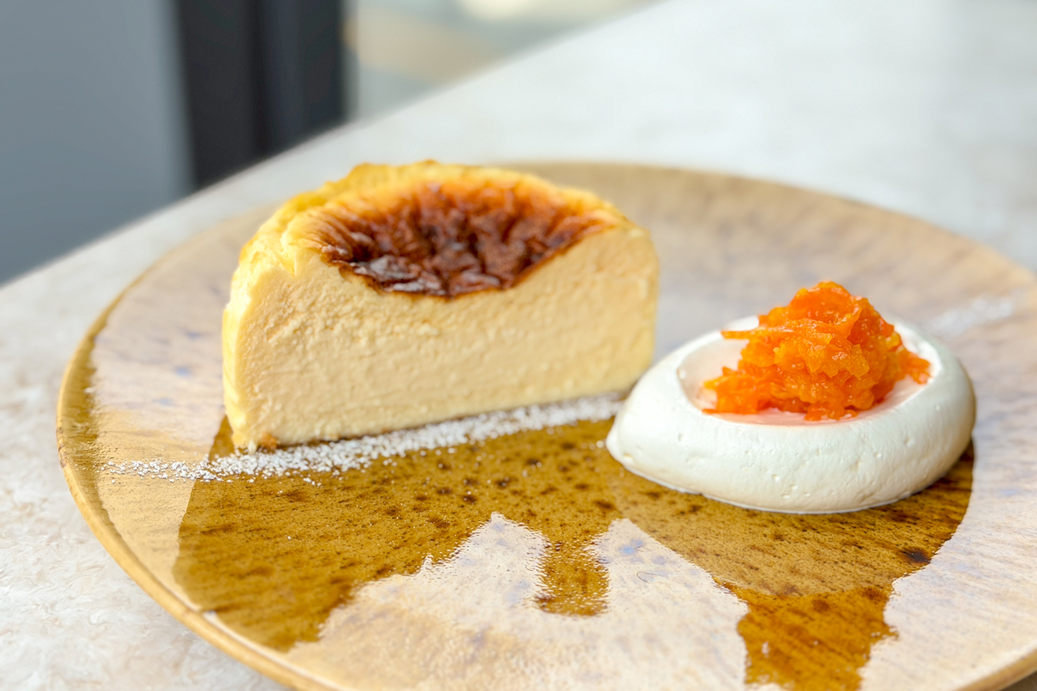 バスクチーズケーキに添えられているのは、オレンジマーマレード風味のキャロットラペ! シャキシャキとした歯ごたえが新鮮で、濃厚なチーズケーキとの相性が抜群。