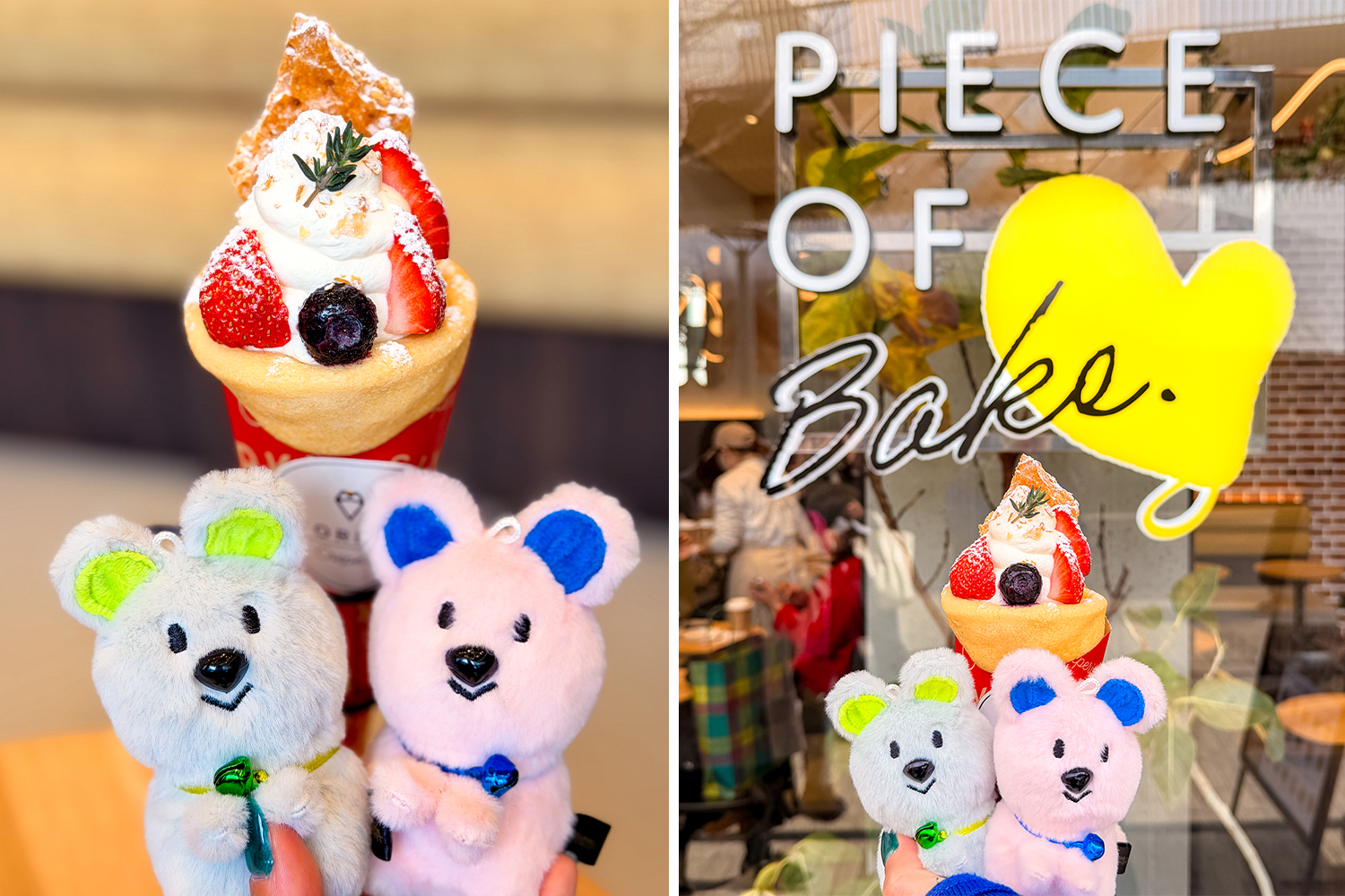 そんなときは、ぬいを手に持って少し上にあげるのがオススメ! 手に持つだけでクレープとの距離が縮まって、一気に映え写真に♪(左写真)