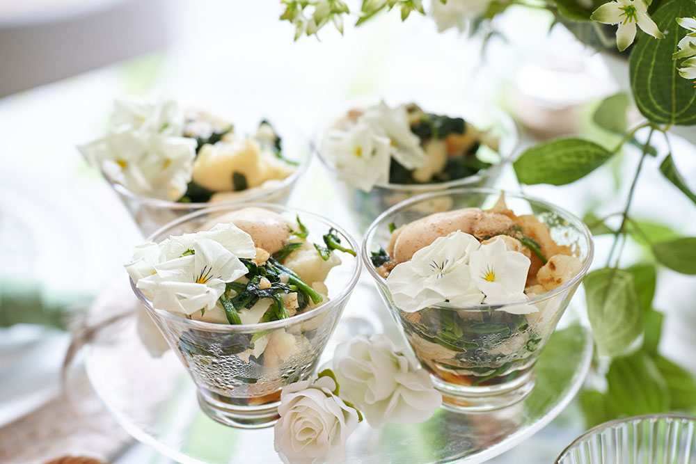 - 買ってきたお惣菜は、おしゃれな食器やハーブ、エディブルフラワーでSNS映えを演出!