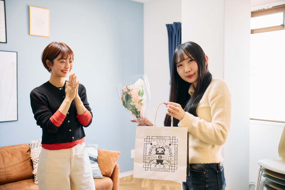 手土産も大阪ステーションシティで。お花は「ファレットフルールKITTE大阪店」のフラワーバイキング。そして、エキマルシェ大阪の「麦の家」のキンパや、うめきたグリーンプレイスの「R Baker(アールベイカー)」のパン。どっちも大好き!