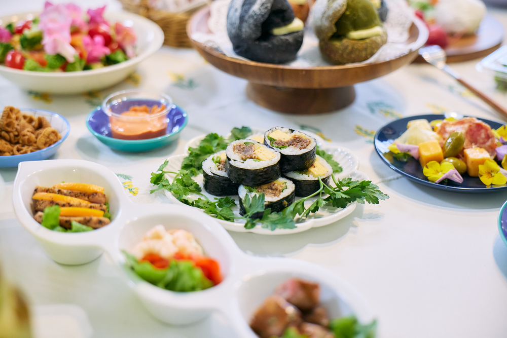 お皿に盛り直し&ハーブとお花の効果は絶大! キンパや詰め放題サラダも、見違えるようです。