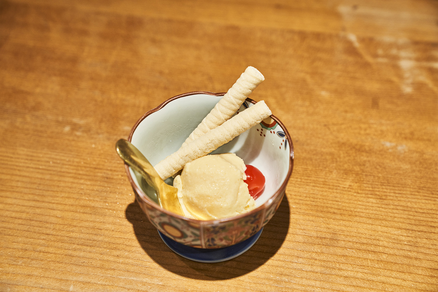 ハシゴ酒の最後には、〆のデザートが欠かせない! さっぱりとした甘さに日本酒がふわりと香る、日本酒アイスをいただきます。「どの日本酒がいちばんアイスに合うか、改良に改良を重ねた一品です」と聞いて納得。だって、めっちゃおいしいもん!!