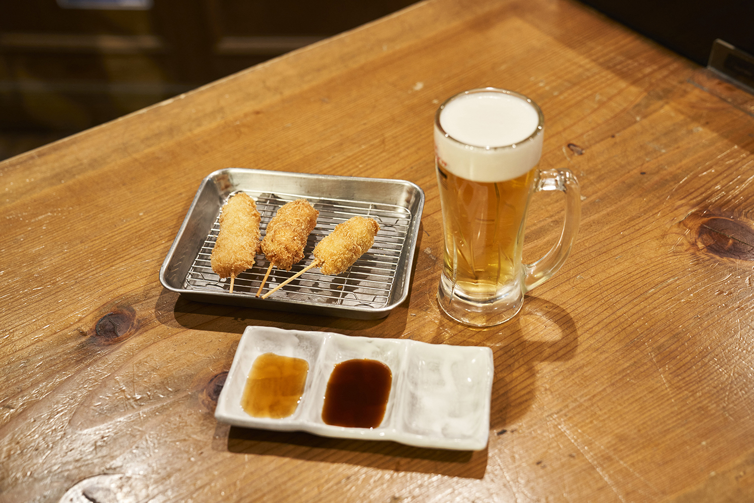 串カツは単品メニューも豊富で、特に豚ロース・ハムカツ・チーズが人気だそう。たこ焼きなんていう変わり種も!