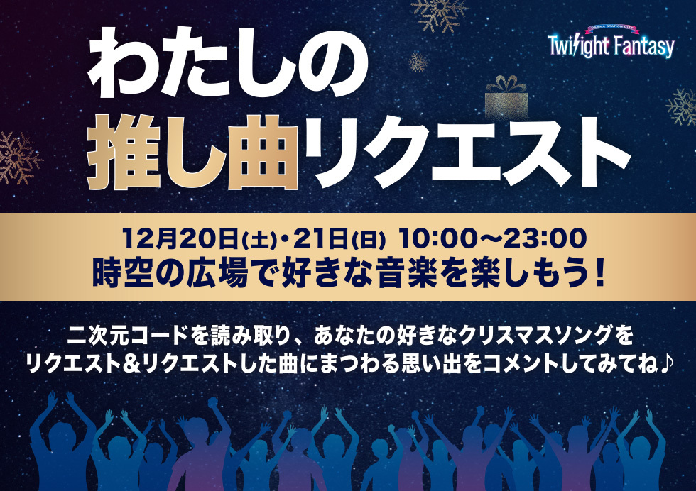 時空の広場で好きな音楽を楽しもう!時空の広場内のポスターの二次元コードから好きなクリスマスソングをリクエストすると、リクエストした曲が広場で再生されます。広場内モニターではミュージックビデオも流れます。ぜひ好きなクリスマスソングをリクエストいただき、その曲にまつわる思い出をコメントしてみてください♪