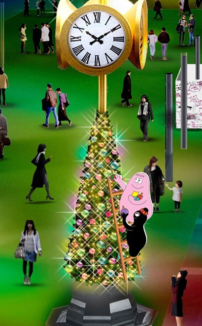 バーバパパとバーバママがまさに装飾を施している瞬間を切り取ったような印象的なクリスマスツリー。