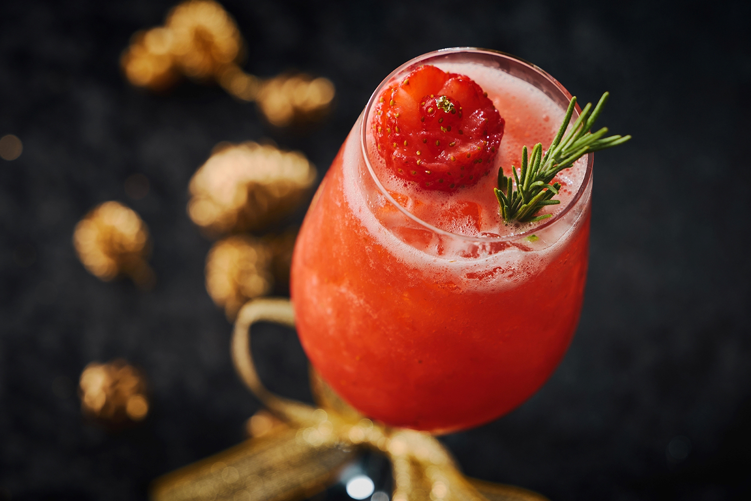 いちご色にきらめくウェルカムカクテルで、クリスマスに乾杯